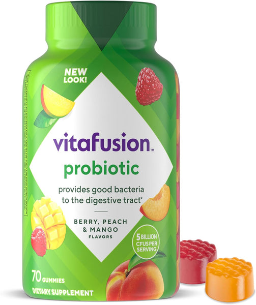 Vitafusion™ Probiotic gummies provides good bacteria to your digestive tract with 2 probiotic strains of 5 billion CFUs per serving. Your gut's health plays an important role in your overall wellness so enjoy these yummy mango, raspberry and peach flavored gummies!